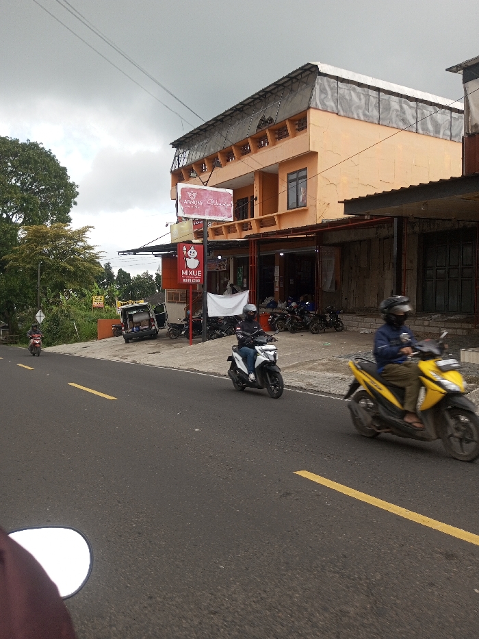 The image depicts a street scene in Ciherang, Indonesia, under an overcast sky. The view is from a low perspective, partially obstructed in the bottom-left by a motorcycle's mirror and a person's shoulder. In the foreground, an asphalt road with visible texture occupies the lower half of the frame. A solid yellow line runs along the left edge of the visible road, and a dashed yellow line is present closer to the center, indicating lanes. Three individuals are operating motorcycles on the road. In the immediate midground, on the right, a person wearing a blue jacket, helmet, brown pants, and sandals is riding a yellow scooter, blurred by motion. Slightly behind and to the left, another person, wearing a black jacket, helmet, blue jeans, and white shoes, rides a black and white scooter. Further down the road on the left, a third individual, also wearing a helmet, is on a red scooter. To the right of the road, a paved shoulder leads to a series of commercial buildings. Numerous motorcycles and scooters are parked on this paved area, suggesting a parking or waiting zone for the establishments. A white utility van or small truck is parked further left on this shoulder. The main building on the right is a multi-story structure with an orange or peach-colored facade. It features multiple windows and balconies on its upper floors. The top level has a semi-enclosed structure, possibly an awning or a screened area. At ground level, several storefronts are visible, some open to reveal interiors. Two prominent signs are affixed to the building: a horizontal red sign with white lettering for "HARMONY" and another word, and below it, a vertical red sign featuring a panda logo and "MIXUE" in white text. The background on the left consists of dense green foliage from trees, suggesting a vegetated area adjacent to the road. Overhead utility lines traverse the upper portion of the frame against a uniformly gray, cloudy sky.