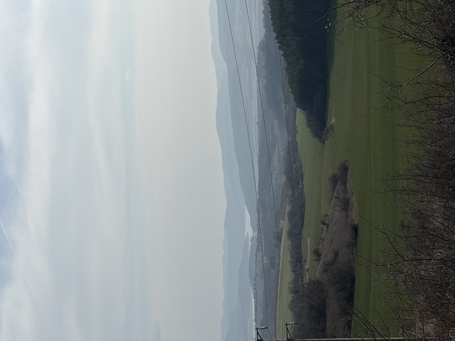 The image presents a panoramic landscape view situated in Royak, Bulgaria. The upper two-thirds of the frame consist of an overcast sky, displaying a uniform light grey to pale blue hue. Distant, layered mountain ranges are visible along the horizon, exhibiting atmospheric haze. Below these, a large, still body of water, consistent with a lake or reservoir, is present in the mid-distance. The middle ground comprises rolling terrain covered by a mix of bare deciduous trees, shrubs, and patches of evergreen forest. Multiple dark power lines are observed stretching horizontally across this section. The foreground is dominated by expansive, vibrant green agricultural fields. To the right, a dense coniferous forest forms a boundary with the fields. On the far left, a utility pole with multiple crossarms and associated power lines is partially visible. The immediate foreground includes bare, intertwining branches and twigs. No human subjects, animals, or discernible actions are depicted. The lighting is diffused, indicating an overcast daytime.