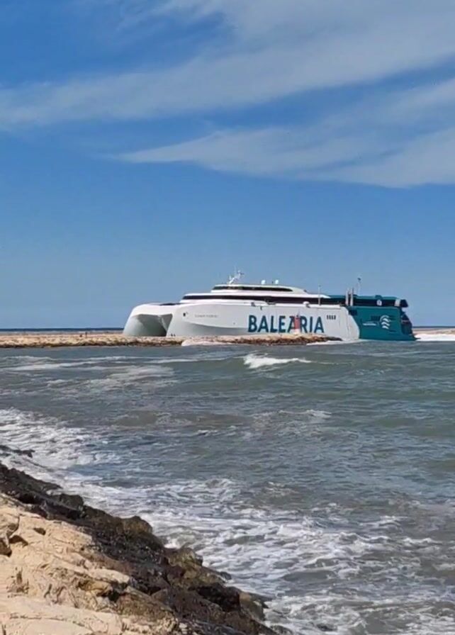 From a low vantage point near a rocky shoreline, a video captures a Balearia ferry gliding along the water