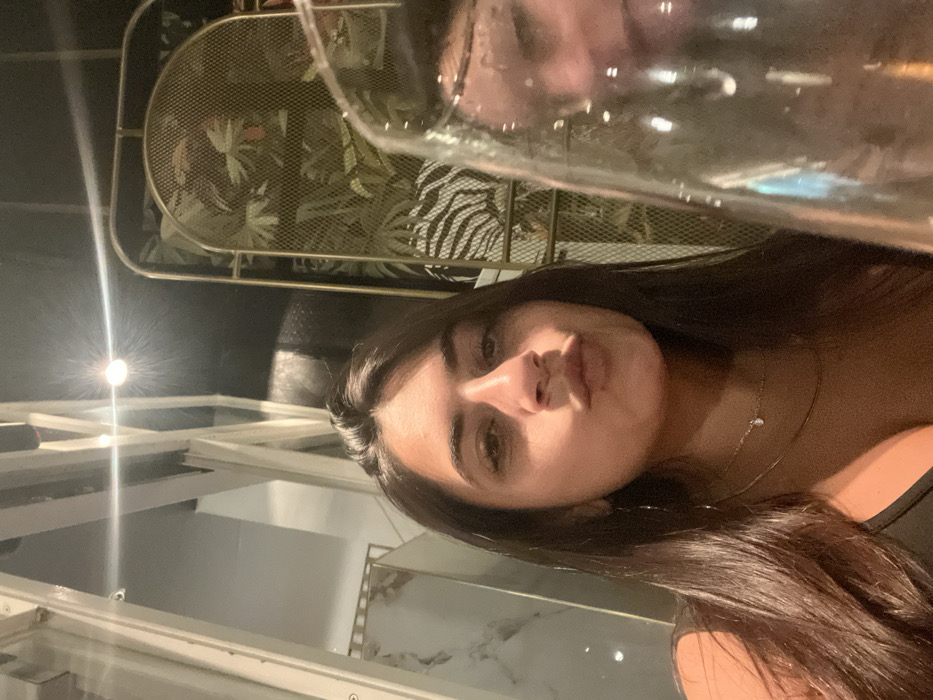 A woman with long, dark hair poses for a selfie. She wears a simple necklace. A glass filled with liquid is positioned above her, partially obscuring the view. Behind her, a decorative grate hangs above a zebra-striped pattern. A window frame is visible to her left. The lighting is dim and appears to be indoors.