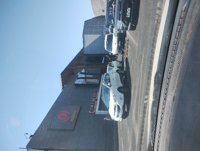 A low-angle shot depicts a Cinemark movie theater beside a road with parked cars. The theater’s modern facade is visible, featuring a "mallplaza" logo and the Cinemark name in bold lettering. A row of cars lines the parking area, including a white hatchback, a small van, and a black SUV. The sky is clear and blue, and the image is taken from inside a car, with the dashboard visible in the foreground.