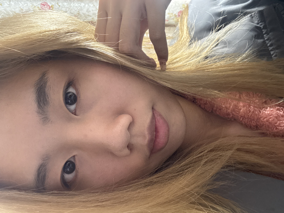 A close-up portrait shot depicts an East Asian female individual in Shapingba District, China. The individual, centered in the frame, has a fair complexion, dark eyes, and dark eyebrows. Her hair is long, light blonde, and appears to be dyed, falling over her shoulders. She wears a dark grey or black puffer-style jacket, beneath which a segment of a textured, reddish-pink fabric (possibly a scarf or inner garment) is visible. Her left hand is raised, with fingers slightly curled, touching the blonde hair near her left ear. She maintains direct eye contact with the viewer, exhibiting a neutral facial expression with closed lips. The background is indistinct but appears to be an indoor setting, with a subtle floral or patterned design faintly visible on the right side behind her.