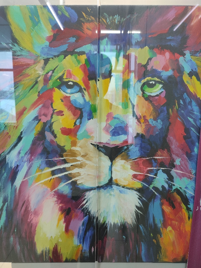The image displays a brightly colored, impressionistic painting of a lion's head, viewed through a reflective surface that exhibits prominent reflections of fluorescent lighting and an indistinct background