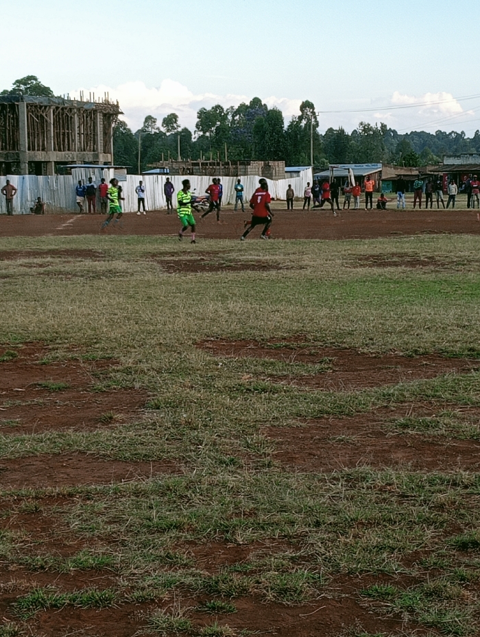A soccer game is in progress on a partially grassy field. Players in red and green striped jerseys compete. A sparse crowd watches from behind a barrier along the edge of the field. An unfinished concrete building stands near the sideline. Trees and cloudy skies complete the background. The field itself shows more dirt than grass.