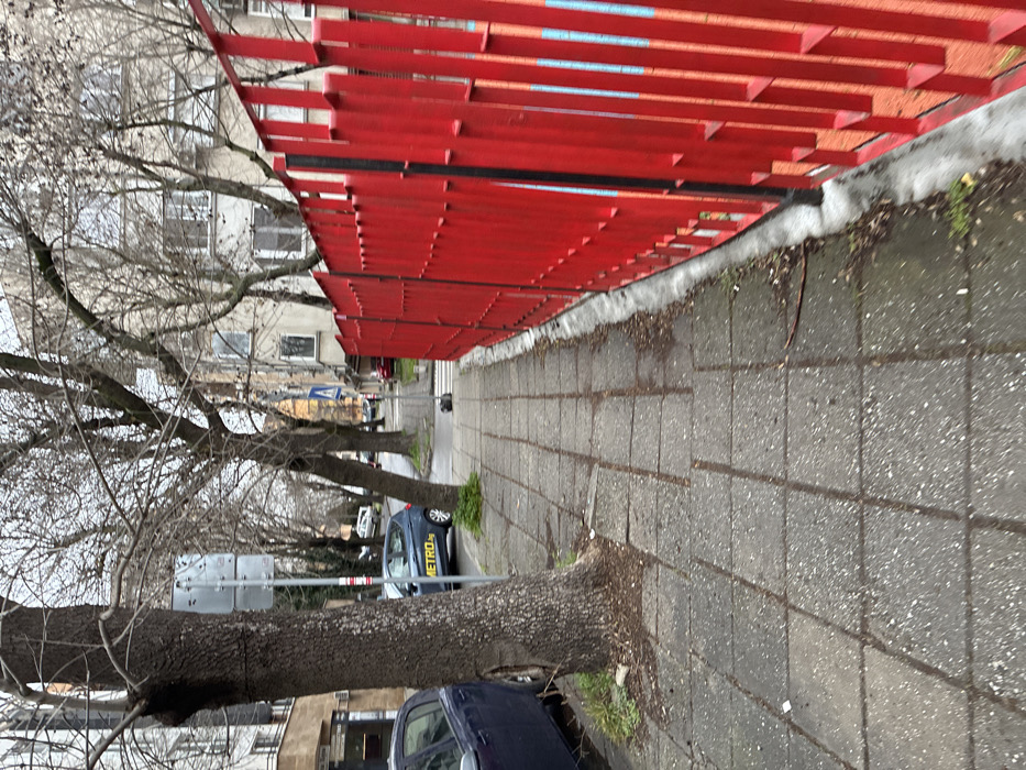 The image depicts an urban street scene in Burgas, Bulgaria. The view is from a low perspective, looking forward along a paved sidewalk under an overcast sky. **Environment and Landscape:** The setting is an urban residential area. The day is cloudy, suggesting a cooler season, evidenced by the bare branches of the deciduous trees. **Subjects and Objects:** * **Foreground Right:** A bright, solid red metal fence, constructed from vertical rectangular bars, runs parallel to the sidewalk, extending into the midground. Portions of light blue and orange patterns are faintly visible behind the red bars on the far right. The fence's base rests on a concrete curb, with a narrow strip of dirt and sparse vegetation visible between the curb and the sidewalk. * **Foreground and Midground Left:** A grey concrete block sidewalk, showing wear and accumulation of dirt and small debris, occupies the left side of the frame. A large tree with thick, dark, textured bark and bare branches stands immediately to the left of the sidewalk. A dark blue passenger car is parked adjacent to this tree, with the yellow text "METRO.bg" clearly visible on its side. * **Midground:** Further down the sidewalk, a metal pole supports two stacked, unreadable grey square signs. A second, thinner pole with a blue square pedestrian crossing sign (featuring a white triangle and black pedestrian icon) is visible further ahead, indicating a pedestrian crosswalk marked by white lines on the street. Another deciduous tree with bare branches is visible behind this sign. A small, dark, cylindrical object rests on the sidewalk near the pedestrian crossing sign. * **Background:** The asphalt street is visible to the left of the sidewalk and trees, with additional parked vehicles and indistinct traffic further in the distance. Multi-story residential buildings, likely constructed of concrete or stucco, with numerous windows, line both sides of the street. **People, Actions, and Interactions:** No individuals are present in the image. No explicit actions or interactions are depicted. **Location:** The scene is an urban street within the city of Burgas, Bulgaria. This identification is supported by the visible "METRO.bg" branding on the parked vehicle, which is a common commercial service in Bulgaria, and the architectural style of the buildings and general infrastructure which are consistent with residential areas in Burgas. The prominent red fence likely borders a public facility such as a playground, school, or sports ground.