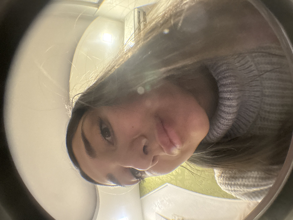 A distorted fisheye view focuses on a woman's face framed within a dark, circular border