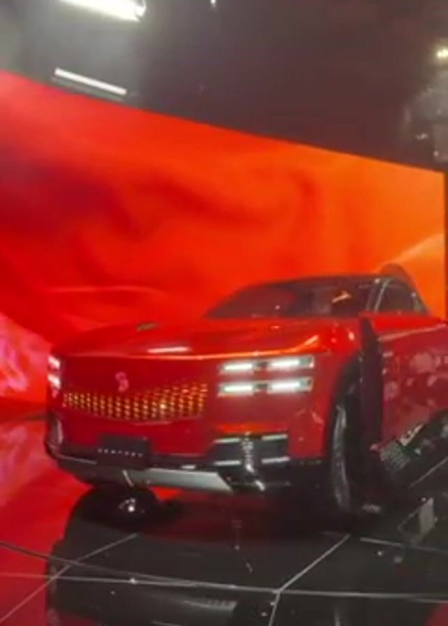 A red car on a black, reflective platform is displayed on a stage. The car has a flat, angular design, including rectangular headlights and a large, detailed grille. Behind the car is a large screen showing a swirling, abstract red pattern. The front passenger door opens up to the side. A bright light shines down from above.