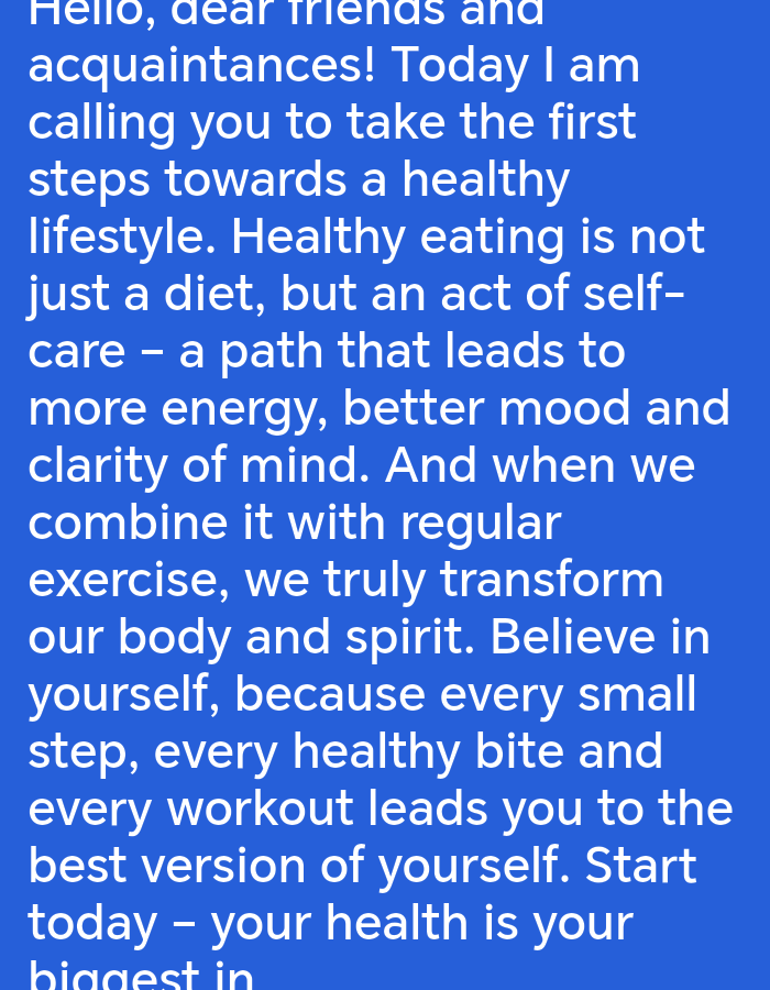 A digital graphic displays white sans-serif text against a solid royal blue background. The text occupies the majority of the frame and reads: "Hello, dear friends and acquaintances! Today I am calling you to take the first steps towards a healthy lifestyle. Healthy eating is not just a diet, but an act of self-care – a path that leads to more energy, better mood and clarity of mind. And when we combine it with regular exercise, we truly transform our body and spirit. Believe in yourself, because every small step, every healthy bite and every workout leads you to the best version of yourself. Start today – your health is your biggest in". No individuals, tangible objects, discernible actions, interactions, or a physical environment are depicted within this image, which is situated contextually in the city of Pazardzhik, Bulgaria.