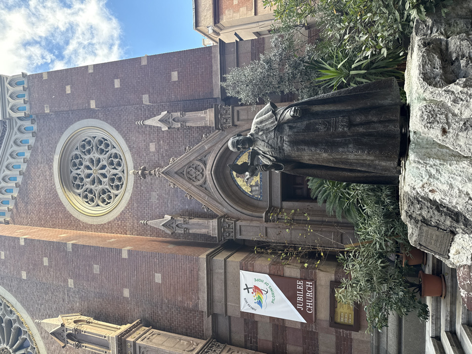 The image displays the facade of the St. Anthony of Padua Church (Sent Antuan Bazilikası) in Beyoğlu, Istanbul, Turkey. The church is constructed of red brick and features Gothic architectural elements, including a prominent circular rose window with intricate stone tracery above the main entrance. The entrance itself is a pointed arch portal with detailed carvings and a mosaic panel above the double doors. In the immediate foreground, a bronze statue of a male figure, dressed in clerical robes, stands on a multi-tiered, rock-like pedestal. The figure holds a bird, possibly a dove, in his raised right hand. A small, inscribed plaque is visible on the lower left side of the pedestal. To the left of the church entrance, a white banner hangs vertically, displaying the text "JUBILEE 2025," "PILGRIMS OF HOPE," and "JUBILEE CHURCH" along with a rainbow-colored cross logo. Below this banner, a brown sign with white text is affixed to the wall, likely indicating operational hours. Various green plants, including shrubs, potted foliage, and small trees, are arranged around the base of the statue and the church facade. The sky above is partially cloudy with blue patches. The scene is illuminated by natural daylight.
