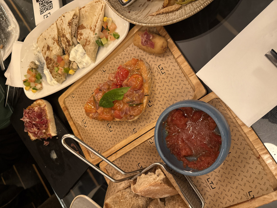 A tabletop presents an array of food dishes: quesadillas with sides, topped bread, a croquette, and a small bowl of what appears to be tomato sauce. Fresh bread is in a wire basket. The food items are arranged on wooden boards. A QR code on a plate and a napkin are also visible.