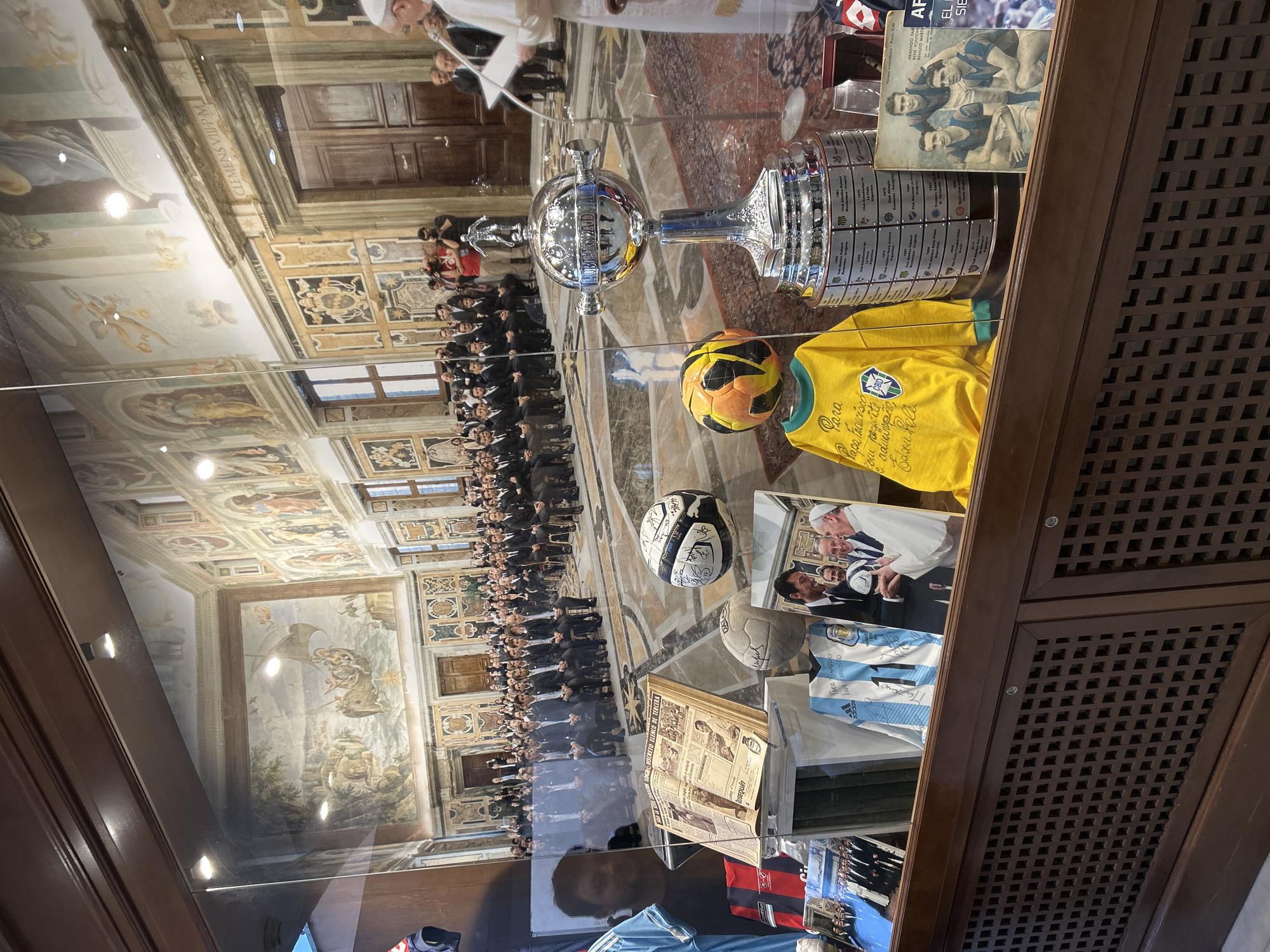 The image depicts a display case in the Clementine Hall (Sala Clementina) of the Apostolic Palace in Città del Vaticano, Vatican City, set against the backdrop of a papal audience. In the foreground, a glass display case with a dark wooden, latticed base showcases an array of soccer memorabilia. Central to the display is a prominent, large, silver Copa Libertadores trophy. Arranged around the trophy are multiple soccer balls, including a signed black and white ball and an orange and black ball. Two distinct soccer jerseys are visible: a yellow long-sleeved shirt, presumably Brazilian, with a handwritten dedication "Para Papa Francisco com respeito Edson Pele," and a light blue and white striped Adidas jersey with the number 11, likely Argentinian, also bearing a dedication mentioning "PAPA FRANCISCO." Vintage sports publications, including an open newspaper/magazine and a print featuring three soccer players, are displayed alongside photographs, one depicting Pope Francis holding a soccer ball with another man. Through the glass, the background reveals Pope Francis, dressed in white papal vestments, standing at a lectern on the right, addressing a large audience. The audience consists predominantly of men in dark suits, seated in rows. Several individuals, including a person in a red shirt with professional camera equipment, are present. The Clementine Hall is ornately decorated with detailed frescoes on the walls and ceiling, including a large fresco depicting a boat on a stormy sea on the upper left wall. The inscription "CLEMENS VIII P.M." is visible above a large wooden door. The floor features a polished, patterned surface with an ornate rug beneath the Pope's position.