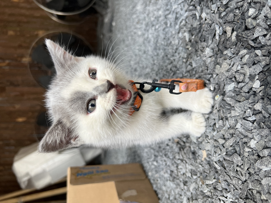 A white kitten with gray markings on its head and ears poses while wearing an orange collar with a black leash attached. The kitten's mouth is open, and it appears to be licking its lips. It is resting on gray gravel. Part of a cardboard box and a blurry object that looks like a white appliance are in the background.