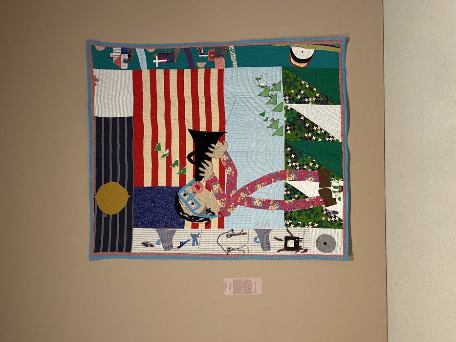 The image displays a large, vertically oriented textile art piece, specifically an appliquéd and quilted fabric artwork, mounted centrally on a plain, light brown gallery wall