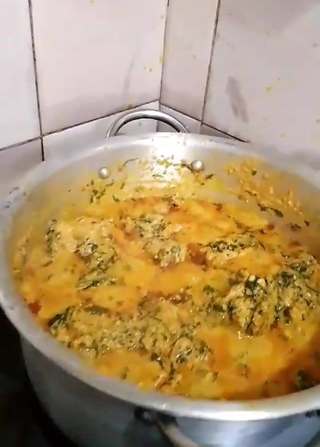A stainless steel pot sits on a black stovetop. Inside the pot is a dish with a creamy, orange-yellow sauce mixed with green herbs and some larger chunks of food. The sauce appears to be simmering. The pot has two loop handles. The backdrop is a wall tiled in a pattern of white and light yellow squares.