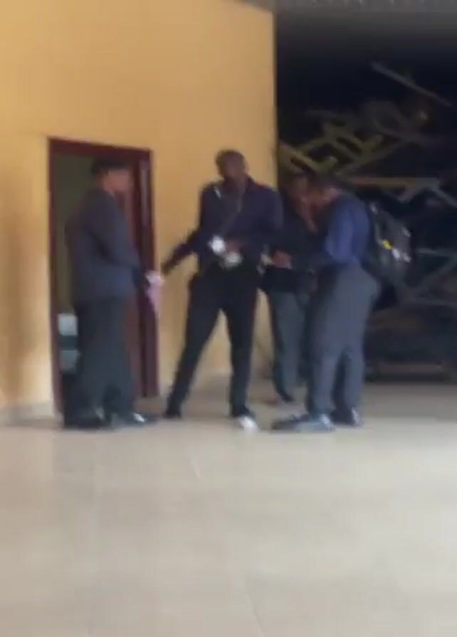 Several people are standing in a hallway, talking and interacting. The hallway has tiled floors and the walls are painted yellow and pink. There is a doorway in the background and some metal debris outside. One man is wearing earphones and holding a roll of cash. Another man throws his hands up in the air while holding a small ball. Other people are standing around, watching the activities.