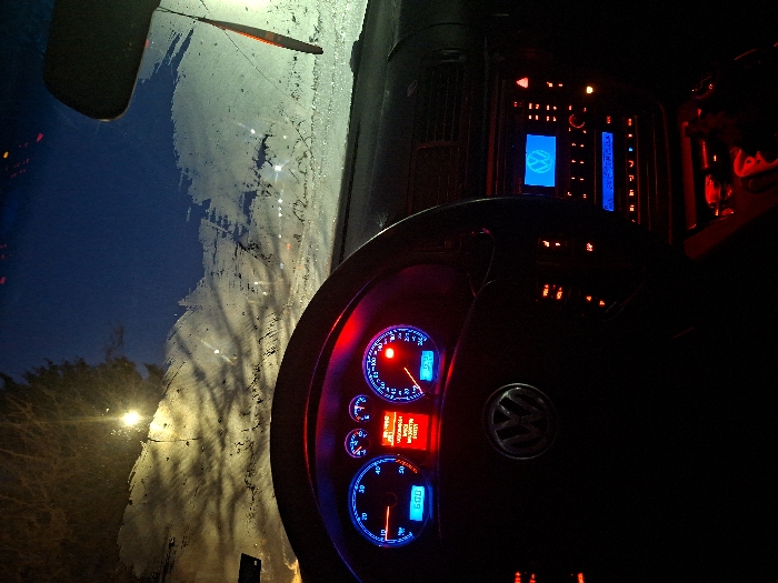 The image presents an interior view from a vehicle, specifically a Volkswagen, looking forward through the windshield at night in Pirdop, Bulgaria