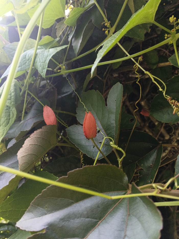 This image displays a close-up view of dense green foliage from a climbing plant, observed in Tamghas, Nepal. The scene is dominated by various shades of green leaves, some appearing deeply lobed or toothed, and others smoother. Numerous slender, coiled green tendrils are visible, extending amongst the leaves. Two prominent, elongated, teardrop-shaped flower buds, distinctly bright red in color, are positioned in the midground; one is located towards the lower left quadrant, partially framed by a dark green leaf, and the other is situated slightly right and above it, against a darker background of leaves. A third, less defined red object is faintly discernible deeper within the foliage on the right. Natural light illuminates the scene, highlighting textures on the leaves and tendrils. No human subjects, animals, or man-made objects are present.