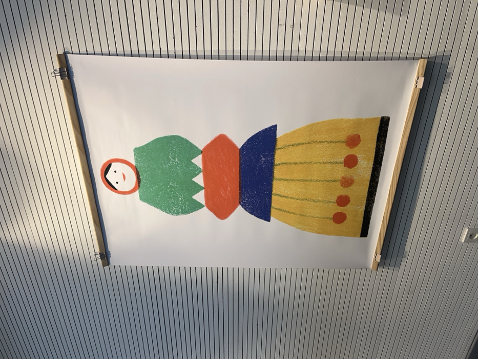 The scene depicts a vertically oriented poster mounted on a horizontally ridged, light gray wall in Sélestat, France. The poster features a stylized, abstract figure composed of stacked, textured, colorful shapes. From top to bottom, the figure includes a red circular head with simple black eyes and a red curved mouth, a green irregular form with a jagged lower edge, an orange flattened hexagonal shape, a dark blue curved half-moon shape, and a yellow bell-shaped form with vertical lines and five reddish-orange circular elements suspended from its base. The poster is secured at its top and bottom edges by light-colored wooden bars, clamped to the paper by three silver-toned binder clips on each bar. A diagonal shadow is cast across the upper left portion of the wall and the poster. A white electrical outlet with two circular receptacles is visible on the wall in the lower left quadrant. The precise building or establishment within Sélestat cannot be ascertained from the visual evidence.