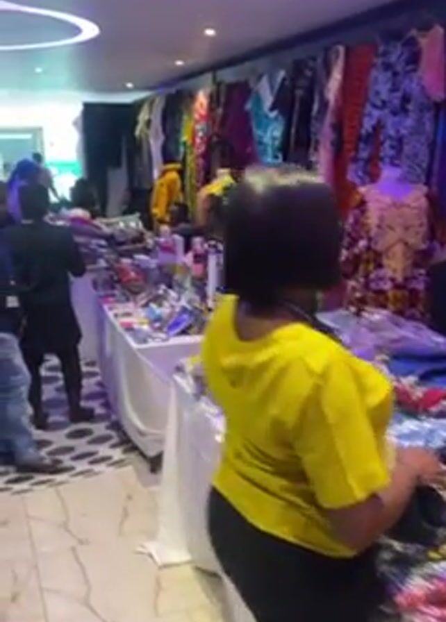 crowded indoor market scene, likely a craft fair or bazaar. Several people are browsing stalls with various items on display. One stall features colorful clothing items hung along the back wall, while the table in front is filled with cosmetics, accessories, and other trinkets. Customers mill around, examining the merchandise and interacting with vendors. The lighting is bright, and the space has a contemporary feel with tiled floors and modern fixtures.