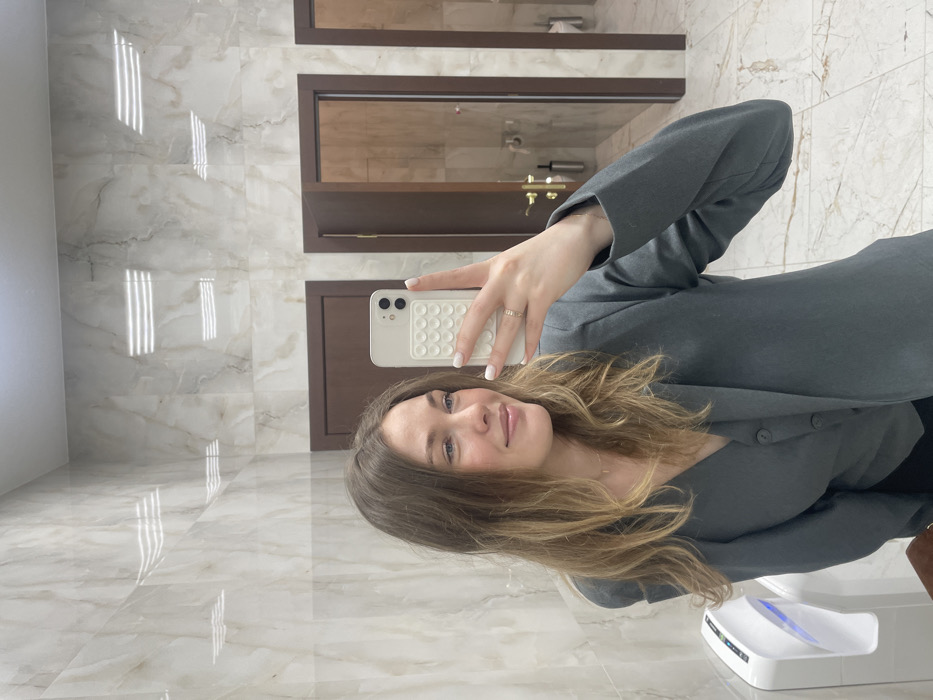 A mirror selfie portrays a young adult female in a modern restroom. The subject, possessing long brown hair with lighter ends and light-colored eyes, exhibits a slight smile while holding a light-colored smartphone equipped with a white pop-it style case in her right hand. Her fingernails are painted white, and a ring is visible on her right ring finger. She is dressed in a dark grey blazer over a matching button-up vest. The environment features light-toned marble-patterned tiles on the walls and floor, reflecting multiple overhead rectangular fluorescent light fixtures. Three dark brown wooden doors are present in the background; the central door is ajar, revealing a partial view of a toilet within a stall. A white automatic hand dryer is partially visible on the left side of the frame. The specific location in Moscow, Russia, cannot be determined from the provided visual data.