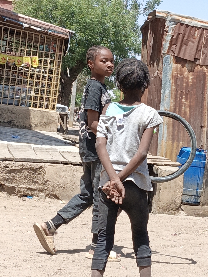 - "The scene depicts two children standing on a light brown, uneven, dusty ground under bright sunlight in Gwagwarwa, Nigeria" by FM-cSMTg1, licensed under CC BY 4.0