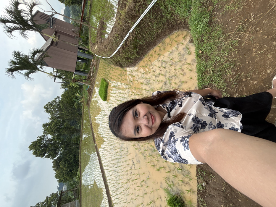 An adult female is captured in a selfie in the city of Selotapak, Indonesia, centered in the foreground. She has shoulder-length dark hair and is wearing a white blouse with a blue floral pattern, a Mandarin collar with frog closures, dark lower garments, and white open-toed footwear. She is smiling directly at the camera, holding the device with her extended left arm. The background consists of extensive terraced rice paddies, partially submerged in muddy water containing young green rice plants. A compact, square section of denser, brighter green rice seedlings is visible within one of the paddies. To the right, two brown, multi-level wooden structures with pitched roofs are elevated on stilts, appearing to be intentionally angled or skewed. These structures are situated amidst green foliage, including palm trees, against a backdrop of distant hills covered in dense trees. A white flexible pipe runs along the earthen embankment that borders the rice fields on the right side of the frame. The sky is overcast.