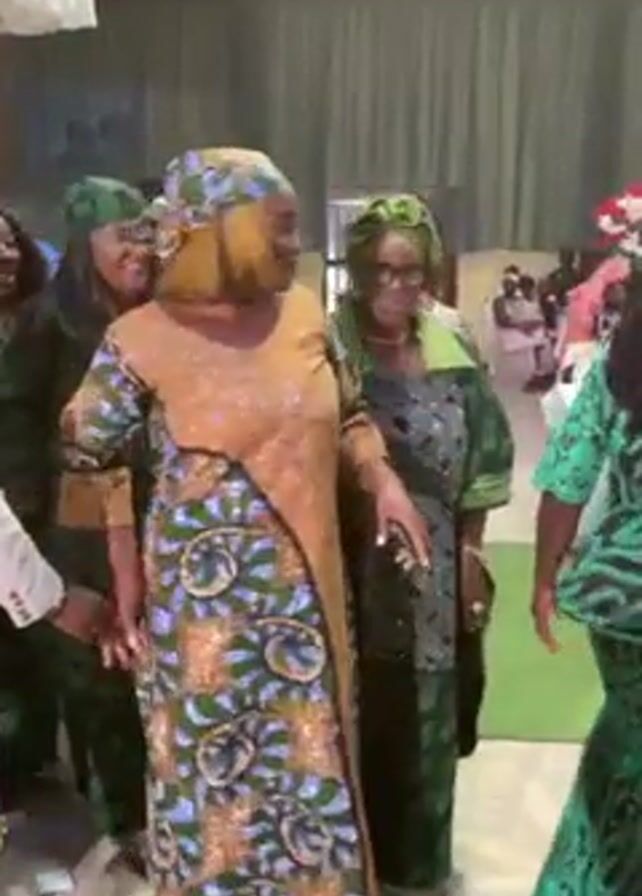 The video depicts a group of women dancing at what appears to be a wedding reception or a similar celebratory event. Most of the women are wearing traditional, colorful dresses and headwraps, primarily in green and gold hues. The room has muted green walls, white trim, and a light-colored floor. Some decorations, including draped white fabric, are visible on the ceiling. The women appear to be enjoying themselves, laughing and engaging in lively conversation as they move. One man in a white suit is also visible in the periphery. The focus of the video seems to be on capturing the joyful and festive atmosphere of the event.