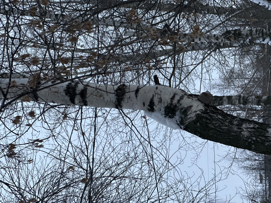 A stark winter scene features a prominent birch tree branch, its white bark marked with black streaks and patches of snow. A small bird perches atop the branch near the trunk. A rectangular object rests on the branch to the right of the bird. Surrounding the branch is a dense network of bare tree branches against a grey sky. The image conveys a sense of quiet stillness and the stark beauty of a winter landscape.
