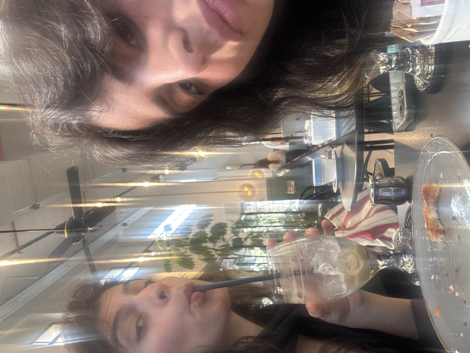 A selfie-style photograph depicts two women inside a modern cafe in Tel Aviv, Israel. The image exhibits strong reflections, suggesting the presence of a glass partition or window between the subjects and the background. In the immediate foreground on the right, the face of the individual holding the camera is partially visible, showing dark, wavy hair, a segment of the right eye, nose, and lips with visible makeup. To her left, another woman with dark hair is shown in profile, drinking from a tall, stemmed glass filled with ice and a light brown liquid, using a dark straw. She holds the glass with her left hand. On the dark-colored table in front of the subjects, a grey, textured plate holds crumbs and a single piece of what appears to be a pastry. Other items on the table include a small metallic creamer, a white ceramic cup with a blue rim resting on a saucer, a partially open silver-colored laptop, a smartphone in a clear case, and a white holder containing paper sugar packets. A red and white striped bag is partially visible in the mid-ground. The cafe environment features high ceilings with exposed white structural beams and a multi-bladed black ceiling fan. Large windows or glass panels in the background allow natural light to enter and create vertical light streak reflections. Through the glass, tall green plants are visible, along with blurred figures of other patrons, dark seating, and architectural elements including a wall with a light green lower section.