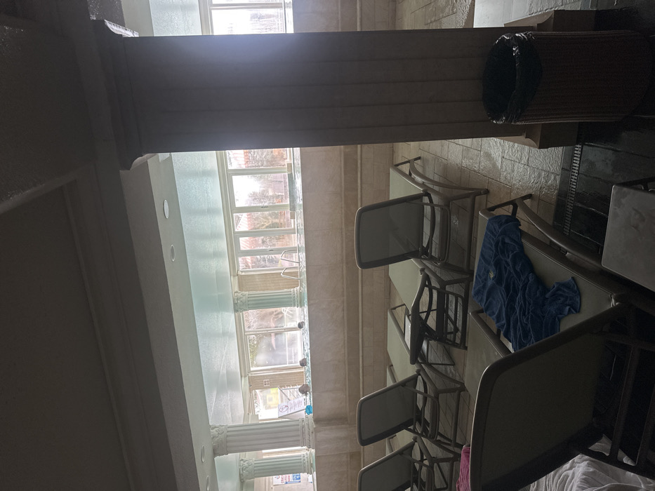 The image depicts an indoor swimming pool and lounge area within a facility located in Kranevo, Bulgaria. The foreground features a tiled floor, appearing wet in sections, with a drainage grate visible on the right. Six unoccupied lounge chairs with light-colored mesh fabric and dark frames are arranged, facing away from the camera. A blue towel is draped over the lounge chair closest to the viewer on the left, and a pink towel is on another. A small side table stands between two chairs in the middle row. To the right, a large, square, light-colored column extends from floor to ceiling, with a woven wicker-style waste bin containing a black liner positioned at its base. Beyond the lounge area, an indoor swimming pool is situated at a slightly elevated level, separated by a light-colored tiled partition. Several white, fluted columns are spaced along the pool's edge. At least four individuals are partially visible within the pool water; their upper bodies are mostly submerged. A white sign with blue text, possibly indicating "CRAB," is visible near the left side of the pool. The background consists of a row of large windows or glass doors looking outwards. The exterior view shows bare trees and some structures, suggesting a colder season. The ceiling is light-colored with recessed lighting fixtures. The overall lighting is dim in the foreground and brighter in the background due to natural light entering through the windows.
