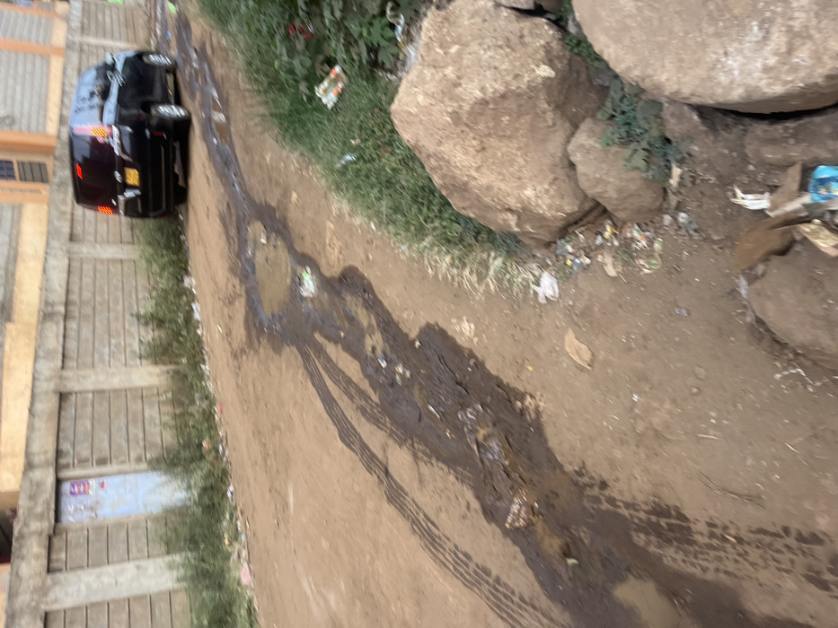 A dirt road bordered by buildings and vegetation. A car, possibly parked or maneuvering, sits beside a gated structure. Streaks of dark liquid, likely water or oil, mark the road's surface with tire impressions. Litter is scattered near the curb and rocks. The scene appears to depict a somewhat unkempt urban or suburban area.