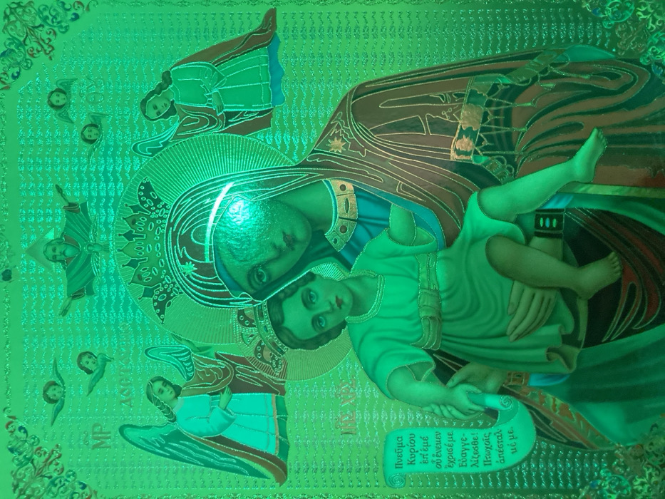 - "The image displays a religious icon, intensely illuminated by a green light source, resulting in a pervasive green tint and pronounced glare on the central figures, notably on the Virgin Mary's forehead and crown" by FM-ccz603, licensed under CC BY 4.0