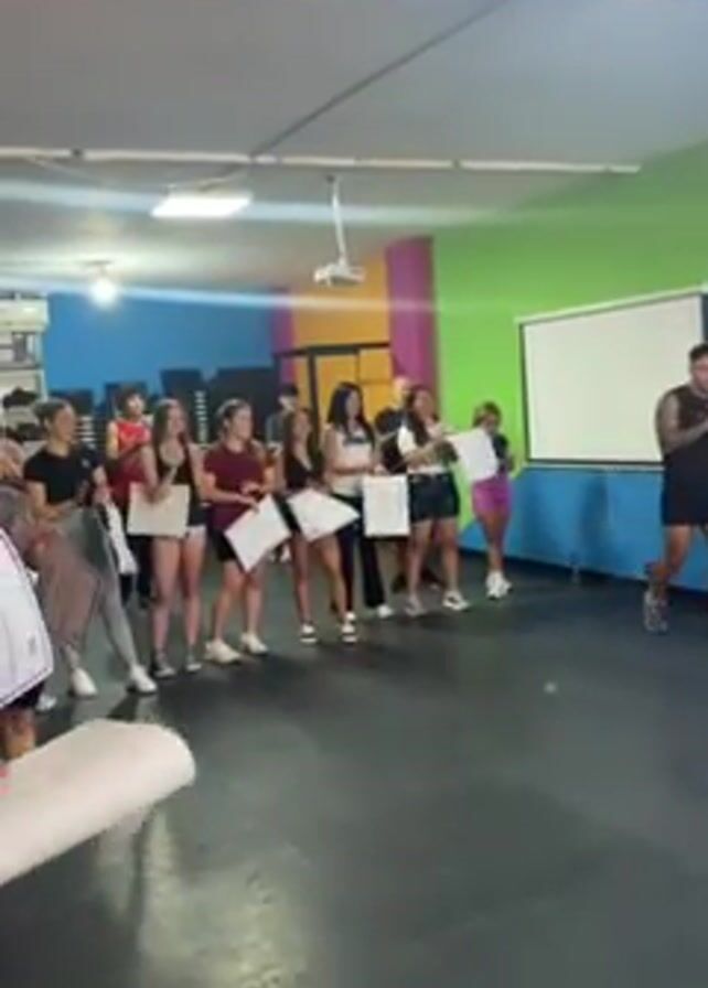 A man stands in front of a line of women, applauding, in what appears to be a gym or fitness studio