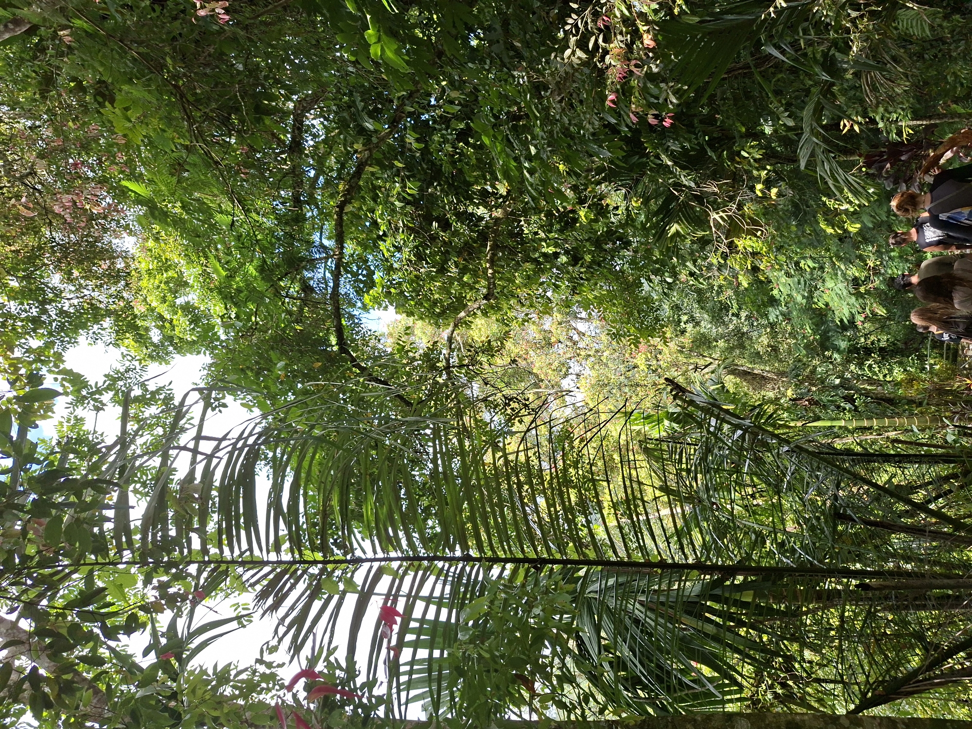 view looking upwards through dense tropical foliage, including palm fronds, in Petang, Indonesia