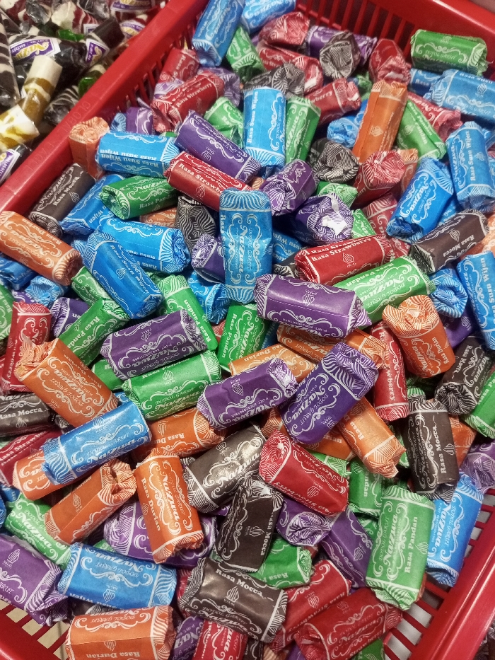 - "The image displays a dense aggregation of individually wrapped, rectangular confectionery items, identified as "Nazwa Dodol Garut," contained within a red plastic market basket" by FM-j17N03, licensed under CC BY 4.0