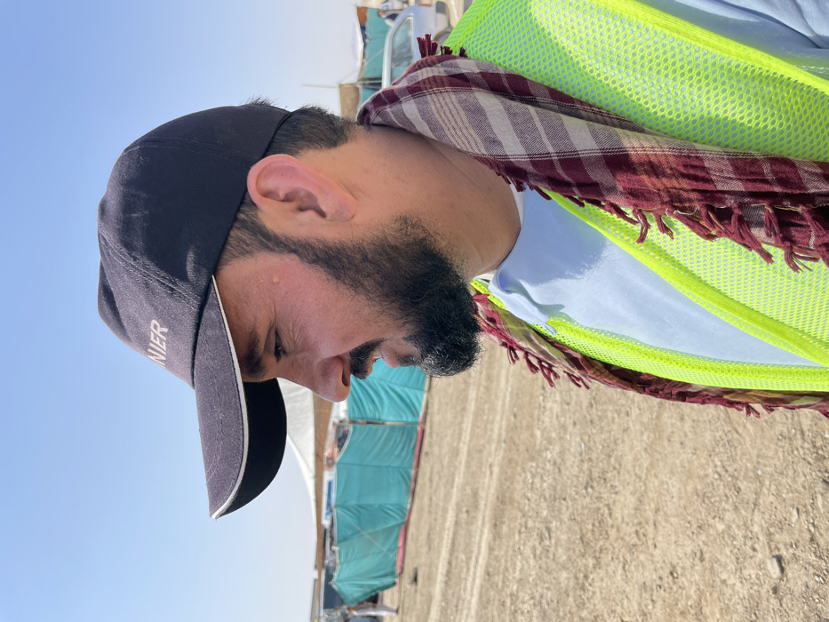 The image depicts an adult male in Pir Dust, Afghanistan, viewed in profile, facing right. He wears a dark blue baseball cap with "NIER" visible on the front, a light blue polo shirt, and a neon yellow mesh safety vest. A red and white checkered keffiyeh with fringe is draped around his neck. He has dark hair, a dark beard, and a short goatee. A small blemish is present on his right cheekbone. His mouth is slightly open, suggesting speech or an imminent vocalization. The background consists of dry, light brown unpaved ground. Behind him, a teal/green tarp structure forms a barrier, with white tents or shelters and faint human figures visible further in the distance. A light-colored vehicle is partially discernible in the far right background. The sky is clear and light blue, indicating bright daylight conditions.