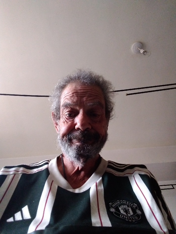 A forensic examination of the image reveals a close-up, low-angle portrait of an older male subject against a plain interior ceiling. The individual, appearing to be in his 60s or 70s, has curly, salt-and-pepper hair and a full, grey beard. His face shows prominent wrinkles across the forehead and around the eyes. He wears a dark green, white, and maroon striped sports jersey, identified by the white Adidas logo on the right chest (viewer's left) and the Manchester United football club crest on the left chest (viewer's right). The subject looks directly into the camera with a neutral to slightly amused expression; his right eye (viewer's left) appears more open than his left. The background is a featureless, light-colored ceiling, likely white or off-white. In the upper right quadrant of the image, a bare light bulb is visible, inserted into a simple white ceiling mount. Below this, two thin, dark, horizontal lines, consistent with cables or rods, traverse the upper-middle section of the frame, extending from the left edge towards the right. The lighting suggests an illuminated indoor environment. The scene is an interior setting, located within Thanet, United Kingdom.