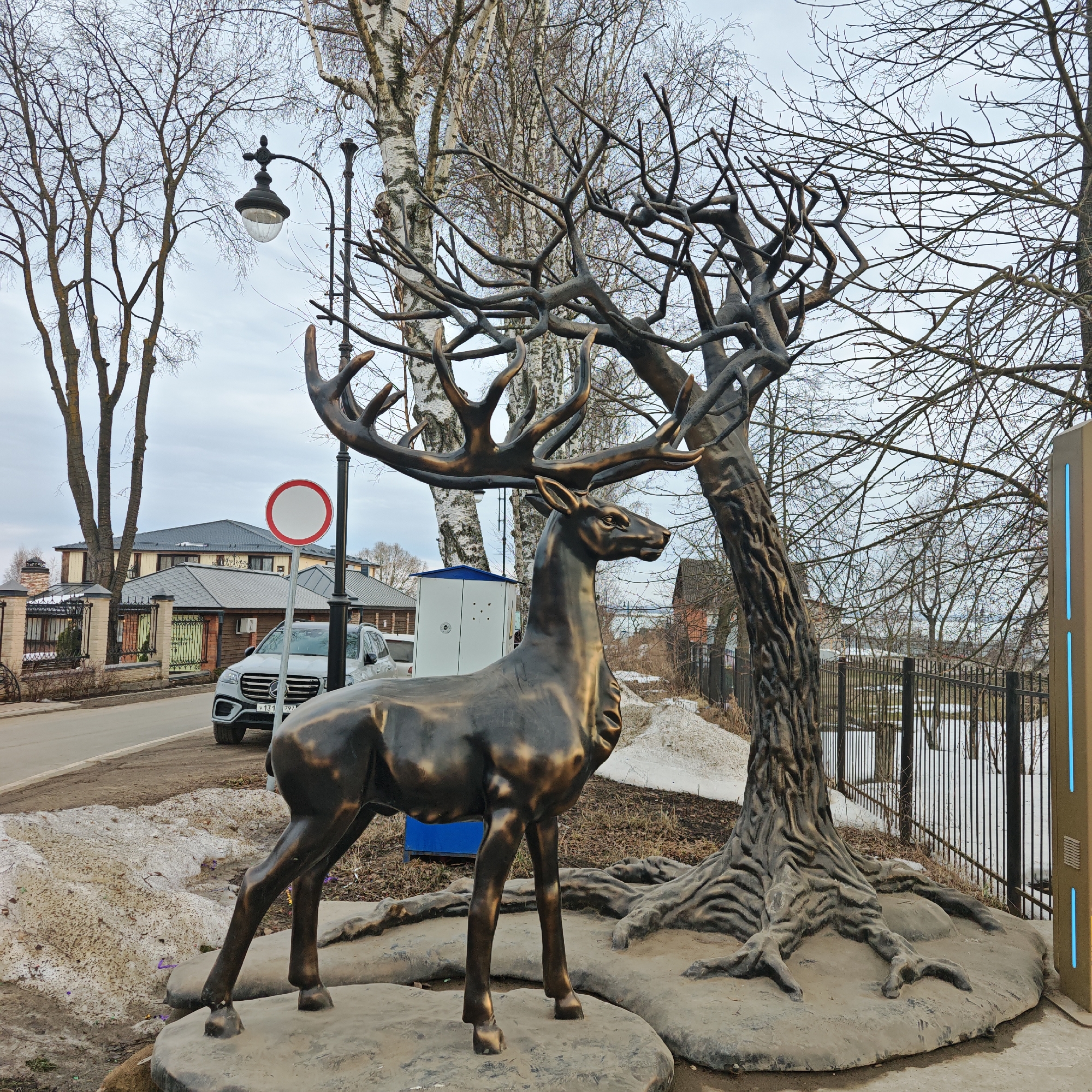 This image depicts a street scene in Novo-Nikol'skoe, Russia, under an overcast sky, indicating late winter or early spring conditions. In the immediate foreground, a life-sized bronze-colored statue of a stag, featuring large, multi-tined antlers, stands facing right on an irregular concrete base. Adjacent to the stag on the right is a dark, intricately sculpted artificial tree, constructed from a similar material, with a textured trunk, visible roots, and a dense network of bare, gnarled branches. This tree also rests on a concrete base. Behind these sculptures, a paved road extends horizontally. A grey Mercedes-Benz GLS SUV is parked on the left side of the road, displaying a partially visible Russian license plate, "y131 797". A red and white circular traffic sign, signifying prohibition, is mounted on a pole near the vehicle. A black, ornate street lamp with a globe fixture is positioned behind the deer's antlers. Further into the background, a line of tall, bare deciduous trees, including several birches with distinctive white bark, parallels the street. Beyond the trees and road, residential buildings with dark-colored pitched roofs and light-toned facades are visible. To the right of the sculptures, a black metal fence encloses an area of uneven ground with patches of melting snow and sparse dry vegetation. A tall, cream-colored informational panel with two vertical blue LED strips is partially visible on the far right edge of the frame. The ground in the foreground consists of dirt and melting snow. No individuals are present in the scene.