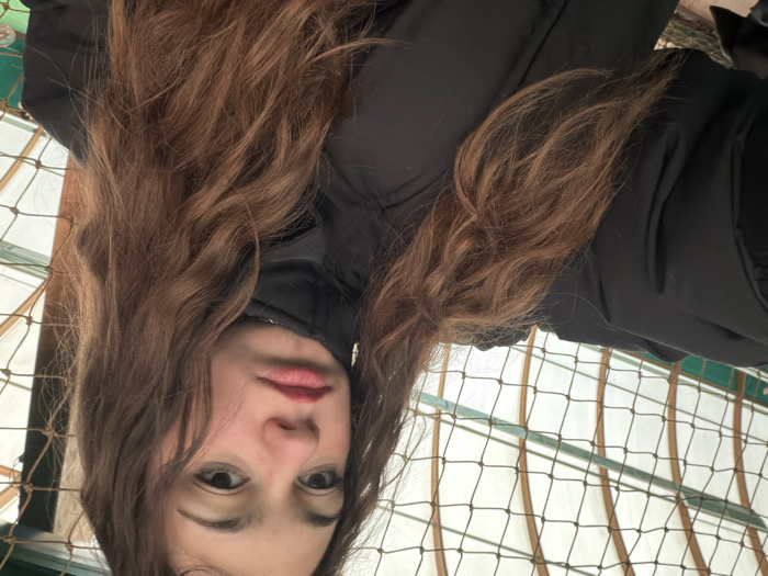 A young female individual is depicted in a close-up, angled portrait, likely a selfie, within a structure in Souffelweyersheim, France. She has long, wavy, reddish-brown hair, parted on the left, cascading over her shoulders and chest. She is wearing a black, high-collared puffer jacket. Her face shows dark eyes, defined eyebrows, and lips with red lipstick set in a slight pout, directed towards the camera. A dark mesh net is visible in the immediate background, with curved, light-brown architectural elements, possibly wooden beams, forming an arc pattern against a light-colored ceiling or wall. Horizontal green structural components are also present in the background. The environment appears to be a covered recreational or public facility.