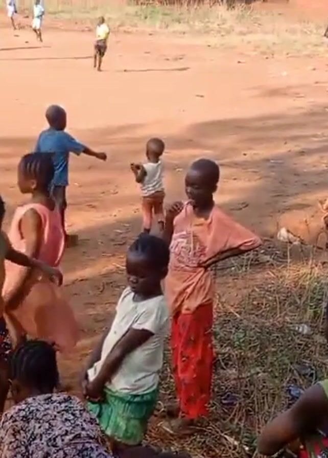 group of children gathered around a dirt field where a soccer game is being played. Some of the children are standing and watching the game, while others are sitting on the ground, some with babies on their laps. The soccer players are wearing yellow and blue jerseys. The field is surrounded by small, simple buildings with thatched roofs. The background shows a hilly landscape with trees and vegetation. The overall atmosphere is communal and informal.
