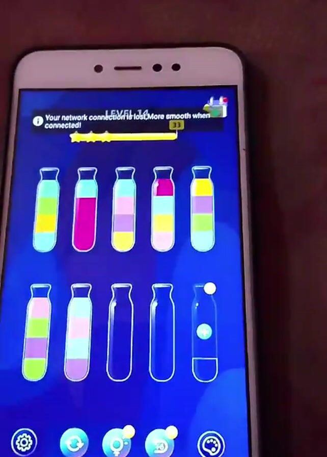 white smartphone displaying a puzzle game. The game interface features colorful liquid-filled bottles and some empty bottles. The screen shows "LEVEL 14" at the top, and the notification "Your network connection is lost. More smooth when connected!". The game involves sorting the liquids into bottles so that each bottle contains only one color. The phone is held and slightly moved while the game is on the screen. The background is dark.