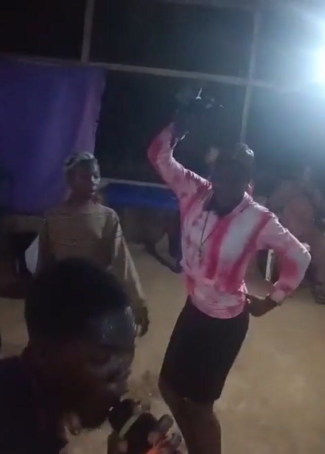 A low-quality video shows a person in a pink-and-white shirt dancing. They are in the center of the frame. A person with a microphone stands closer to the camera and appears to be singing. They are wearing a greenish-yellow shirt. Other people stand or sit in the background. The scene seems to be at night, under dim lights.