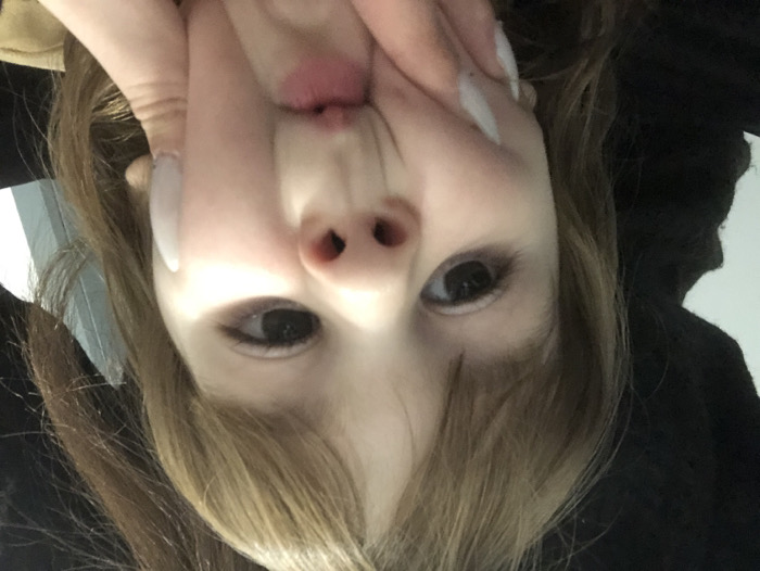 A child's face, angled upward, is being squeezed by a hand with long, pale nails