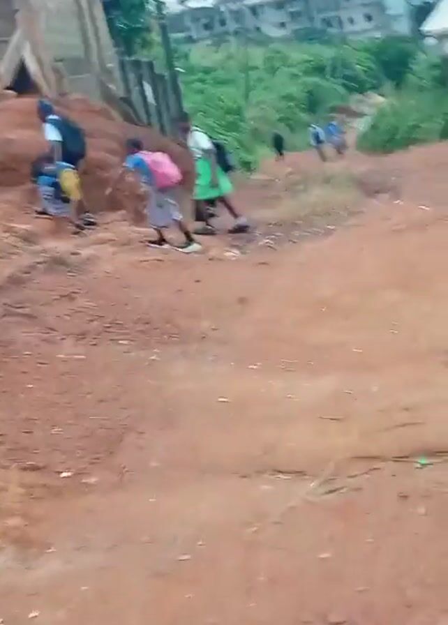 several individuals walking uphill on a dirt path. The ground appears to be reddish-brown. In the background, there is some greenery, including trees and shrubbery. There are also buildings visible in the background. The video is somewhat shaky, and the focus is not always clear.