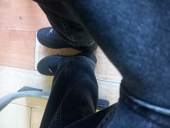 The image, captured from a first-person perspective, displays an individual's lower legs and feet