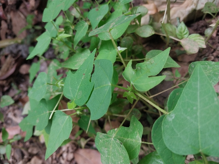 The scene depicts a close-up view of herbaceous vegetation located in Tinaquillo, Venezuela. Multiple plants with green, predominantly heart-shaped to shallowly three-lobed leaves are densely clustered across the frame. Small, light-colored floral structures or buds are visible among the foliage. The ground beneath the plants is composed of dark brown soil intermixed with scattered dried organic matter and plant debris. No human subjects, animals, or dynamic actions are present within the captured image.
