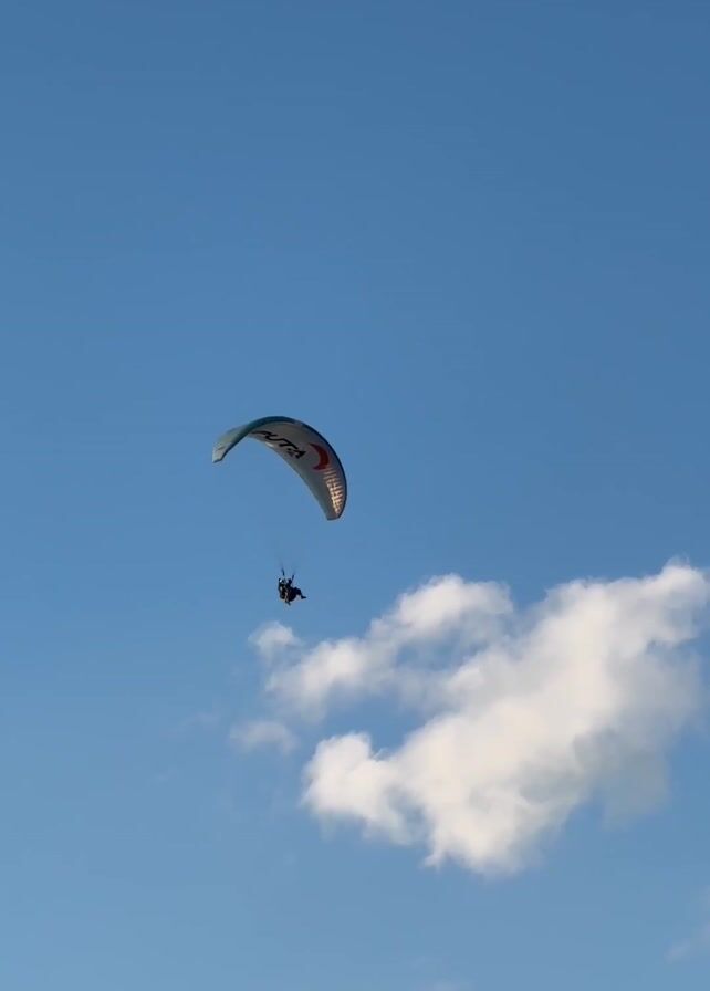 In the video, a paraglider floats against a clear blue sky punctuated by fluffy white clouds