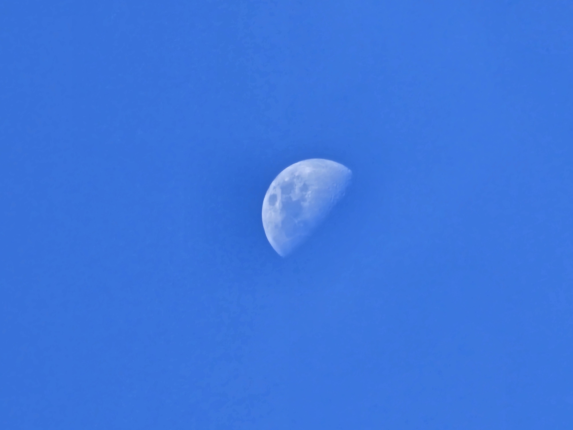 The image depicts the Moon, illuminated in a waxing gibbous phase, visible against a clear, uniform blue daytime sky. Approximately two-thirds of the lunar disk is illuminated from the right, showcasing distinct craters and dark maria on its surface. The Moon is positioned slightly right of the vertical center of the frame. The sky is devoid of clouds or atmospheric haze. No individuals, terrestrial objects, or dynamic actions are present within the scene. The observed location is Esch-sur-Alzette, Luxembourg.