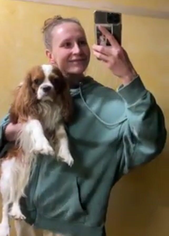 A woman holds a brown and white Cavalier King Charles Spaniel in front of her and takes a selfie in a bathroom mirror. The woman has light skin and her hair is pulled back in a bun. She is wearing a green hoodie and tan pants. The dog is facing forward with its ears hanging down. The bathroom wall is a yellow-orange color. The woman holds up her phone, which has a photo attached to the back, and points the camera towards the dog's face. The video ends in a blurry shot of the dog's face and the woman's hand holding the phone.