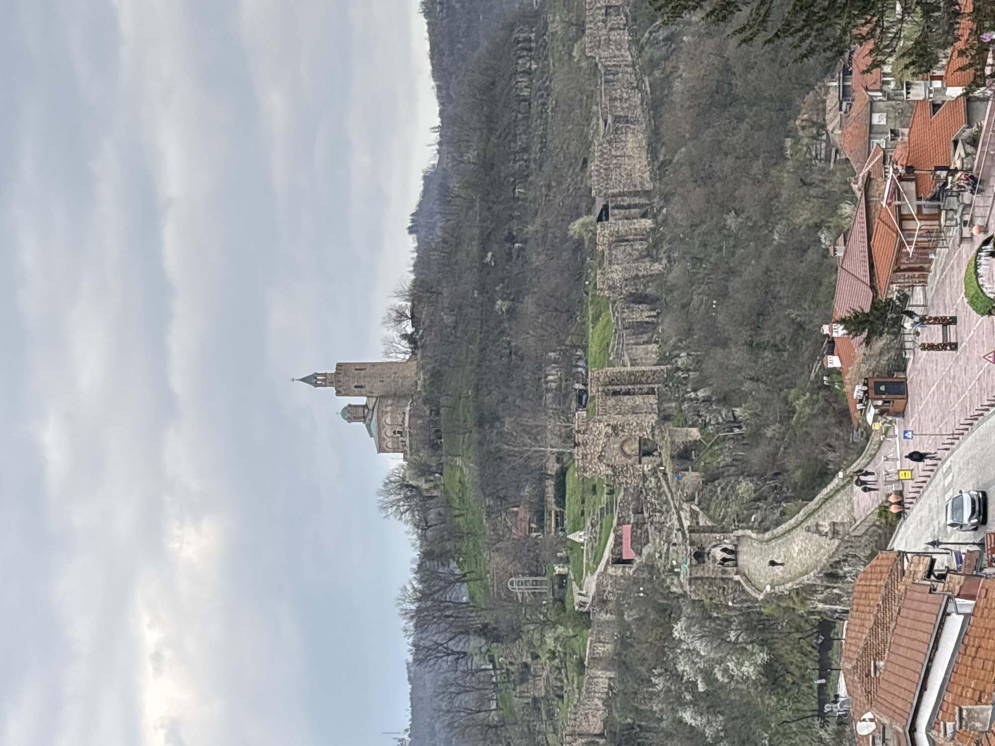 This image depicts the Tsarevets Fortress in Veliko Tarnovo, Bulgaria, situated atop a hill. The fortress, composed of stone walls and towers, dominates the landscape and shows historical ruins in a state of partial preservation. The sky is overcast. To the right of the fortress is a view of residential buildings with orange-tiled roofs, alongside a walkway and street scene with people and a white car. Vegetation is visible on the hillside, consisting of trees without leaves and patches of green grass. The scene combines elements of the historical fortress with the contemporary townscape.